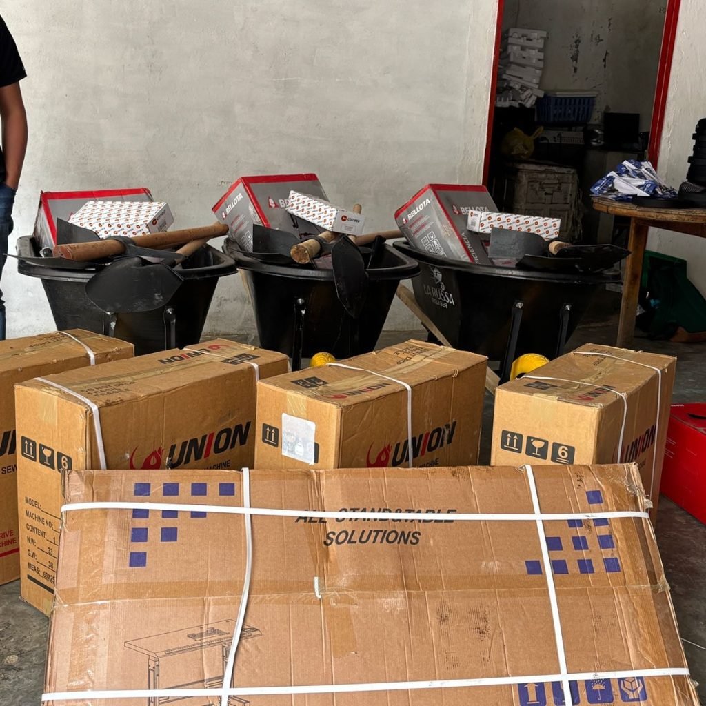 Entre los elementos entregados para apoyar la elaboración del sombrero de pindo se encuentran una máquina de coser eléctrica, tijeras multiuso, agujas familiares, fibra natural de pindo de ocho metros destinada a la elaboración de sombreros tradicionales, palines hoyadores, palas redondas con cabo de madera, tijeras podadoras y carretillas plásticas de 100 litros, utilizadas para el transporte de la fibra.